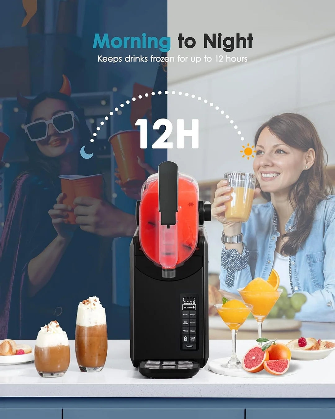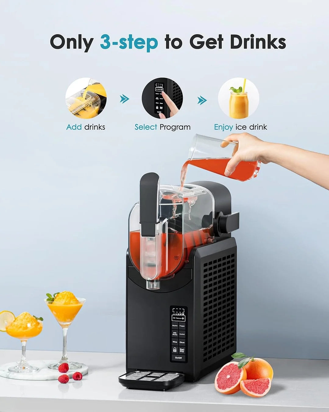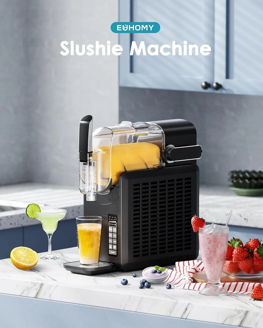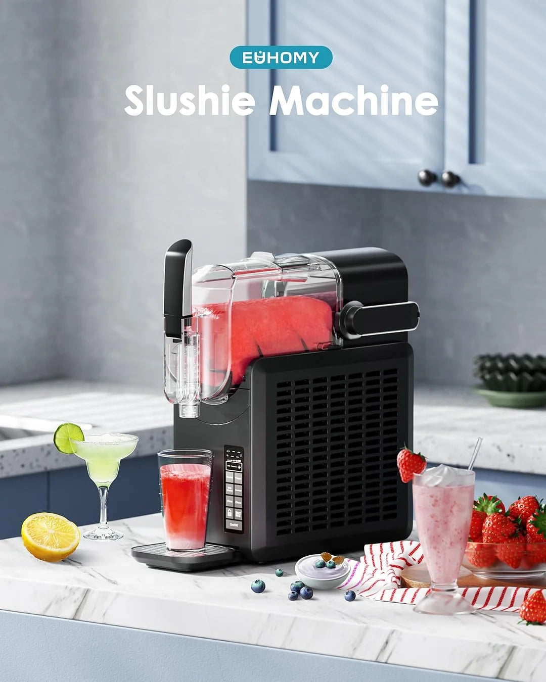 - Simple to Use & Rapid Freezing Technology: EUHOMY slushie machine with user-friendly LED display, All you need to do just press the frozen drinks Program, The powerful compressor enables our professional frozen drink maker to make delicious frozen smoothie drinks in just 15-60 minutes. Smoothie maker makes frozen beverages that last up to 12 hours, for easy access at all times. Gives you all the convenience.