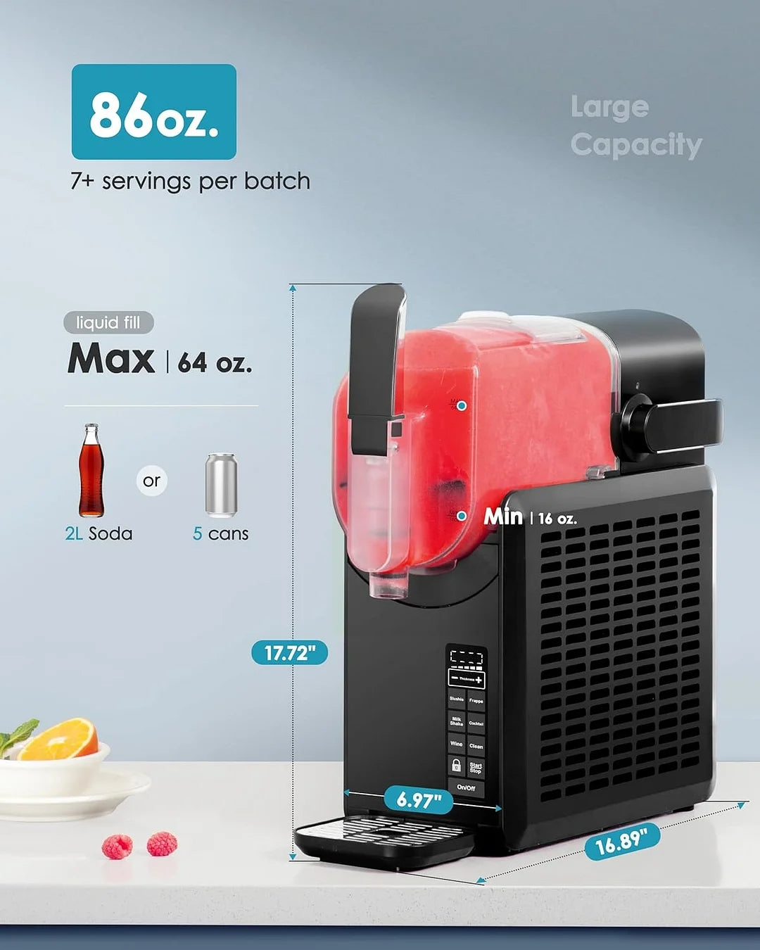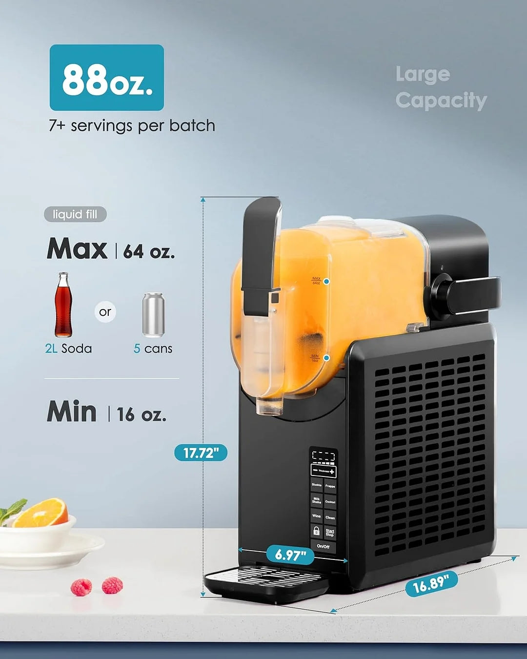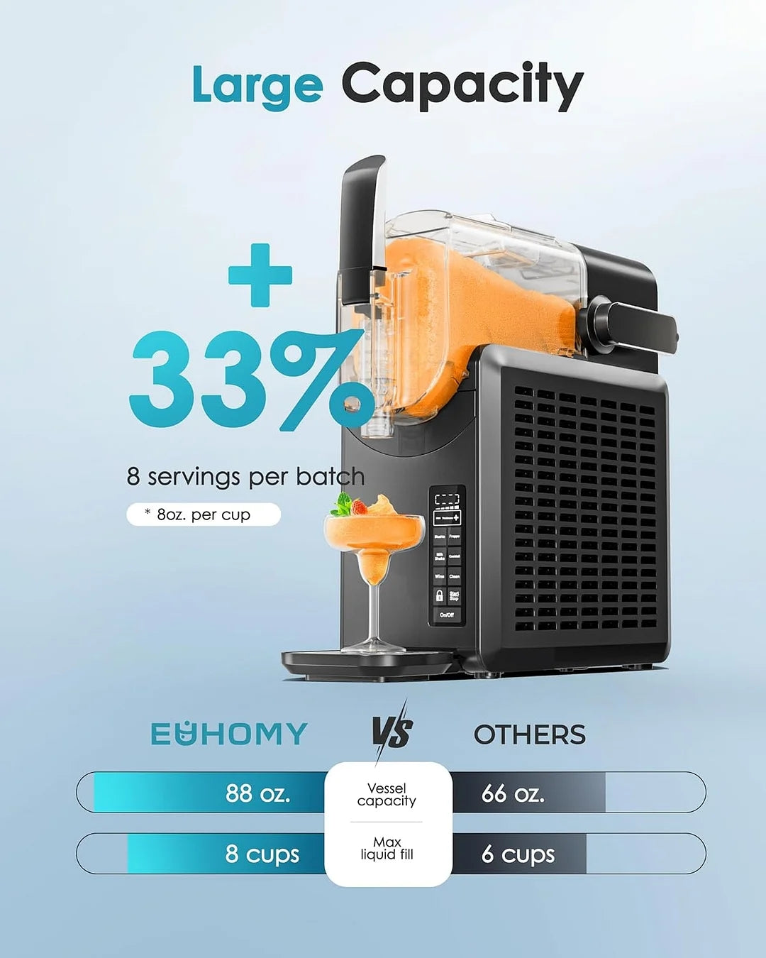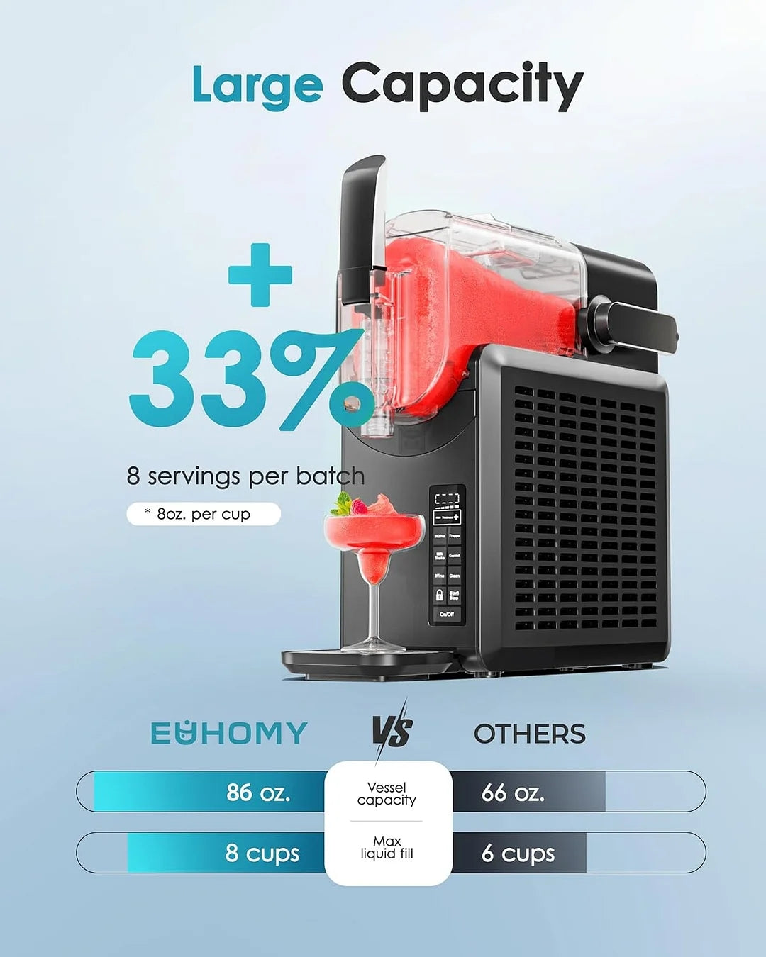 - No Ice Needed & 88oz Large Capacity: EUHOMY slushy machine for home revolutionizes the way you make frozen drinks. Its advanced tech freezes liquids fast without ice, saving you from ice cube hassle. All you need to do is pour in the liquid, press the preset button for the type of slushie you want to make, and then wait to enjoy it. The slushie machine with 68oz(Max) barrel makes it suitable for larger family party. You can make enough slushies to go around.