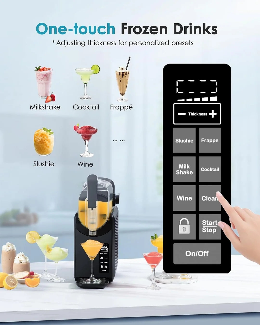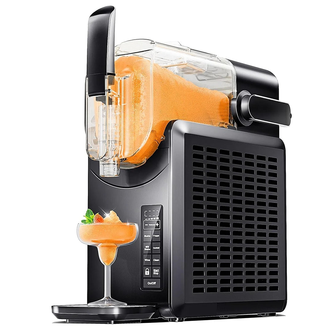 - 5 Preset Programs & Adjustable Smoothie Thickness: EUHOMY slushie machine features 5 preset programs including Slushie, Frappés, Milkshake, Cocktail, and Wine. The user-friendly LED display on the margarita machine provides real-time temperature readings, allowing you to closely monitor the freezing process. You can easily adjust settings for your preferred drink thickness, be it thick and creamy or thin and refreshing.
